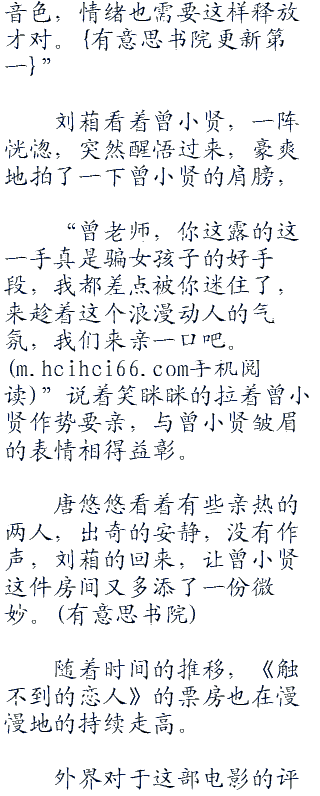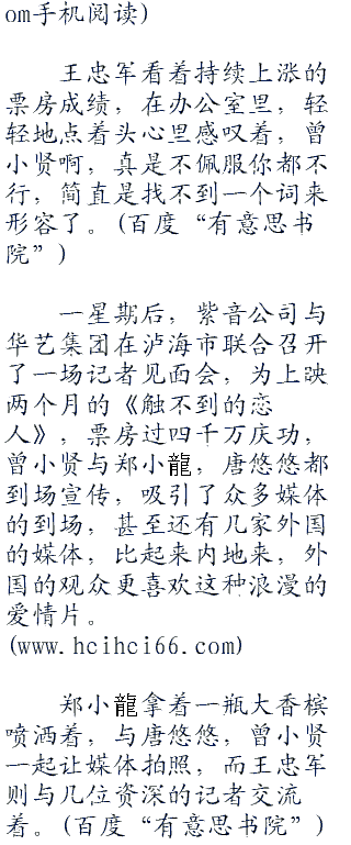 一星期后,紫音公司与华艺集团在泸海市联合召开了一场记者见面会,为上映两个月的《触不到的恋人》,票房过四千万庆功,曾小贤与郑小龍,唐悠悠都到场宣传,吸引了众多媒体的到场,甚至还有几家外国的媒体,比起来内地来,外国的观众更喜欢这种浪漫的爱情片。