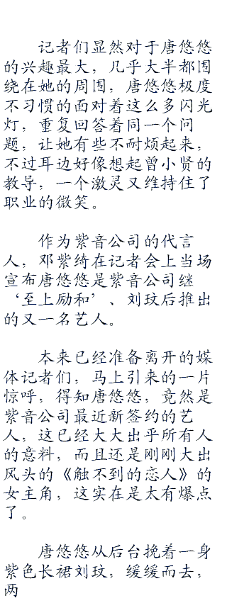 作为紫音公司的代言人,邓紫绮在记者会上当场宣布唐悠悠是紫音公司继‘至上励和’、刘玟后推出的又一名艺人。