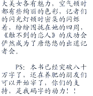 唐悠悠从后台挽着一身紫色长裙刘玟,缓缓而去,两大美女各有魅力,空气顿时都有些绚丽的色彩,记者们的闪光灯顿时密集的闪烁着,纷纷围拢在她的四周,《触不到的恋人》的庆功会俨然成为了唐悠悠的出道记者会。