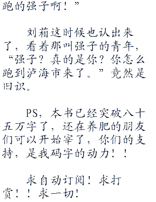 PS,本书已经突破八十五万字了,还在养肥的朋友们可以开始宰了,你们的支持,是我码字的动力!!