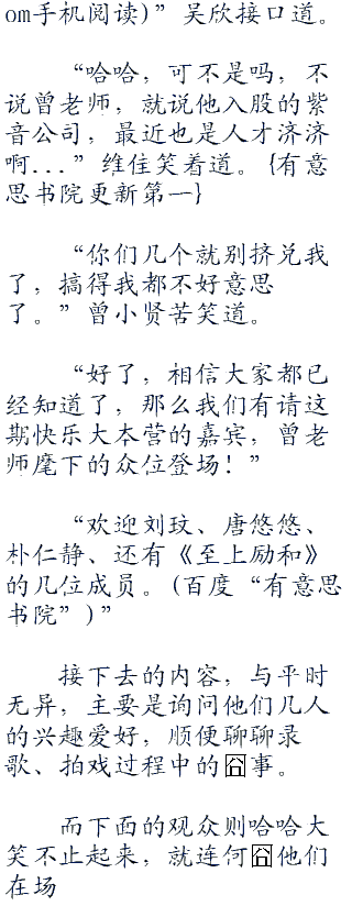 接下去的内容,与平时无异,主要是询问他们几人的兴趣爱好,顺便聊聊录歌、拍戏过程中的囧事。