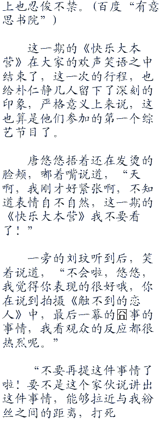 一旁的刘玟听到后,笑着说道,“不会啦,悠悠,我觉得你表现的很好哦,你在说到拍摄《触不到的恋人》中,最后一幕的囧事的事情,我看观众的反应都很热烈呢。”