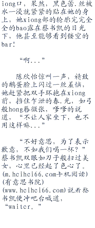 鬼使神差般的,蔡书凯装作喝水时被呛住了,一口水喷在美女的xiong口,果然,黑色蕾.丝被水一浸就紧紧的贴在她的身上,她xiong部的轮廓完完全全的bao露在蔡书凯的目光下,他甚至能够看到镂空的bar!