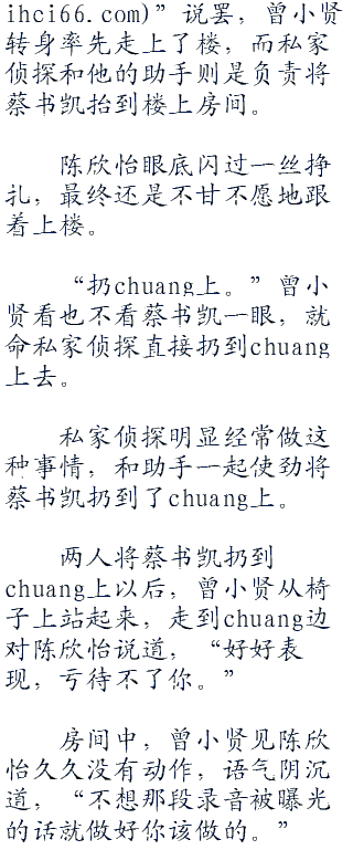 “扔chuang上。”曾小贤看也不看蔡书凯一眼,就命私家侦探直接扔到chuang上去。