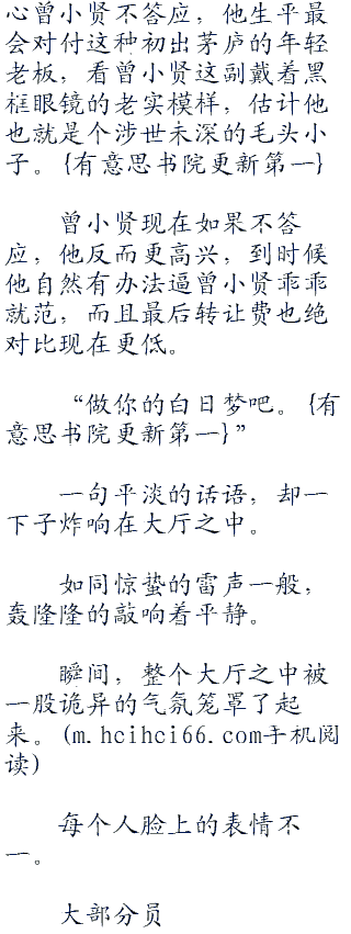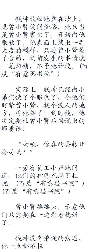 钱坤没有催促的意思,他一点都不担心曾小贤不答应,他生平最会对付这种初出茅庐的年轻老板,看曾小贤这副戴着黑框眼镜的老实模样,估计他也就是个涉世未深的毛头小子。