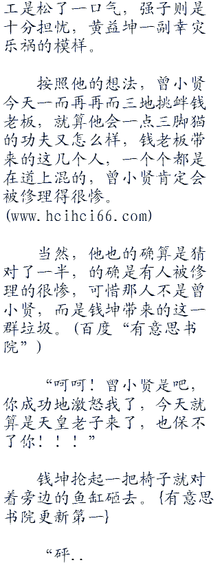 实际上,钱坤已经向小弟们使了个眼色了,令他们盯紧曾小贤,找个没人的地方,将他捆了!到时候,他决定要让曾小贤后悔说出的那番话!
