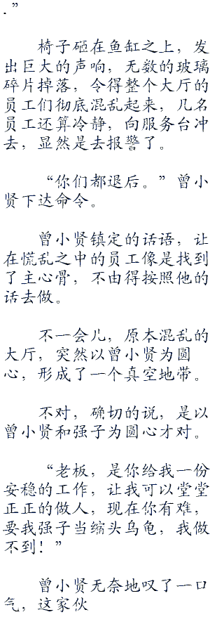 椅子砸在鱼缸之上,发出巨大的声响,无数的玻璃碎片掉落,令得整个大厅的员工们彻底混乱起来,几名员工还算冷静,向服务台冲去,显然是去报警了。