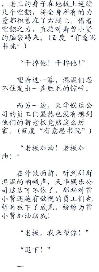 在外敌面前,听到那群混混的呐喊声,天华娱乐公司这边可不依了,那些对曾小贤还抱有敌视的员工们也暂时放下了成见,纷纷为曾小贤加油助威!