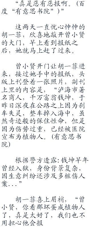 曾小贤开门让胡一菲进来,接过她手中的报纸,头版上刊登着一张照片,副刊上里的内容是,“泸海市著名商人,千万富翁钱坤,于昨日深夜在公路之上因为刹车失灵,整车掉入海中,虽然奇迹般的保住性命,但是因为伤势过重,已经被医院宣布为植物人。