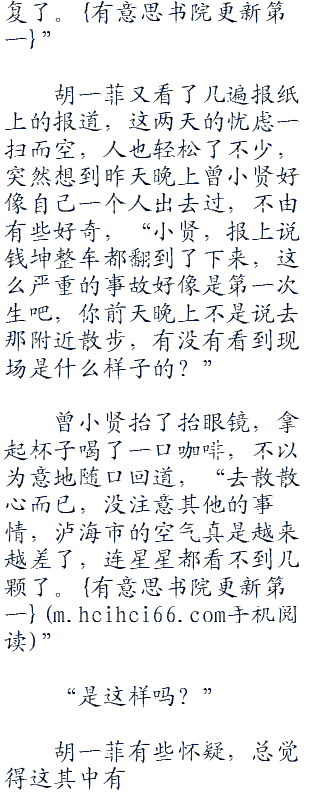 胡一菲又看了几遍报纸上的报道,这两天的忧虑一扫而空,人也轻松了不少,突然想到昨天晚上曾小贤好像自己一个人出去过,不由有些好奇,“小贤,报上说钱坤整车都翻到了下来,这么严重的事故好像是第一次生吧,你前天晚上不是说去那附近散步,有没有看到现场是什么样子的?”
