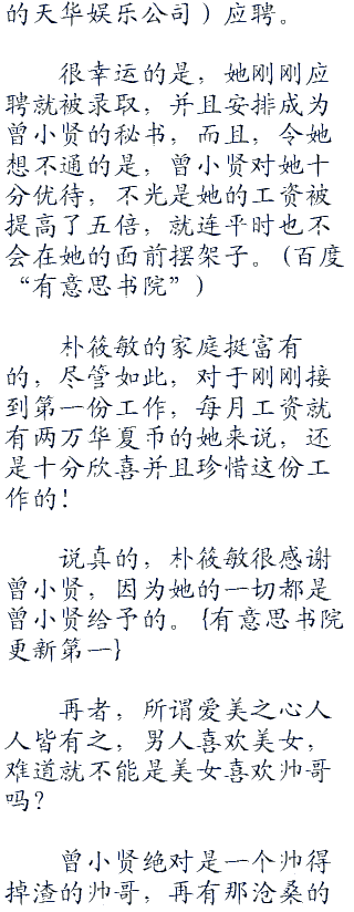 很幸运的是,她刚刚应聘就被录取,并且安排成为曾小贤的秘书,而且,令她想不通的是,曾小贤对她十分优待,不光是她的工资被提高了五倍,就连平时也不会在她的面前摆架子。