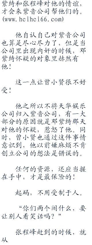 他之所以不将天华娱乐公司归入紫音公司,有一大部分的原因就是邓紫绮那天对他的怀疑,惹怒了他。同时,曾小贤也通过这件事情意识到,他以前嫌麻烦不肯创立公司的想法是错误的。