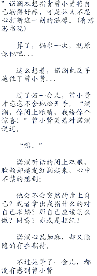 “喂...”诺澜本想指责曾小贤将自己勒得好疼,可是她又不忍心打断这一刻的温馨。