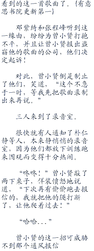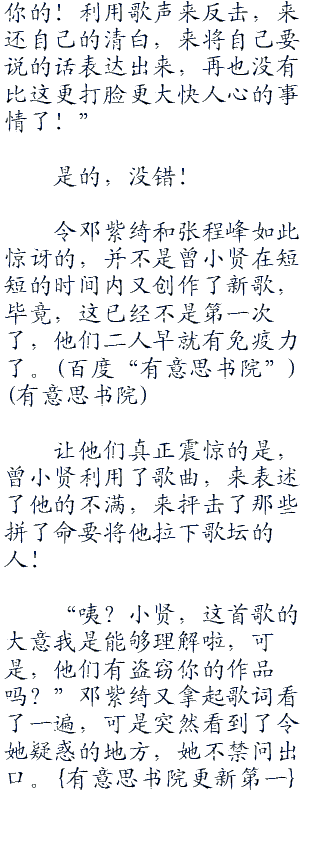 “咦?小贤,这首歌的大意我是能够理解啦,可是,他们有盗窃你的作品吗?”邓紫绮又拿起歌词看了一遍,可是突然看到了令她疑惑的地方,她不禁问出口。