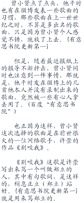 也正因为这样,曾小贤这次选择的歌曲是在前世很火的一位网络歌手,许崇的作品《别咬我》。