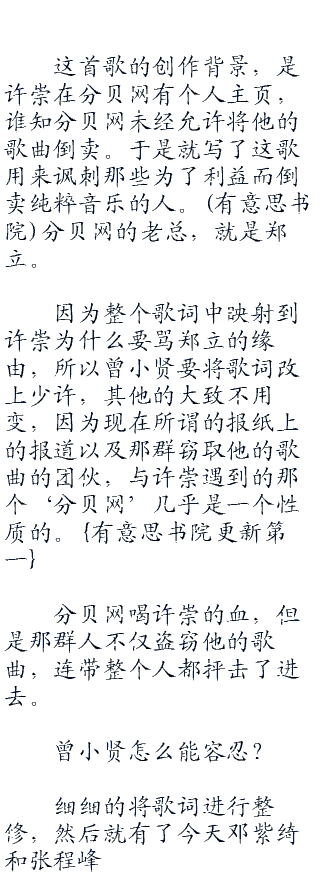 因为整个歌词中映射到许崇为什么要骂郑立的缘由,所以曾小贤要将歌词改上少许,其他的大致不用变,因为现在所谓的报纸上的报道以及那群窃取他的歌曲的团伙,与许崇遇到的那个‘分贝网’几乎是一个性质的。