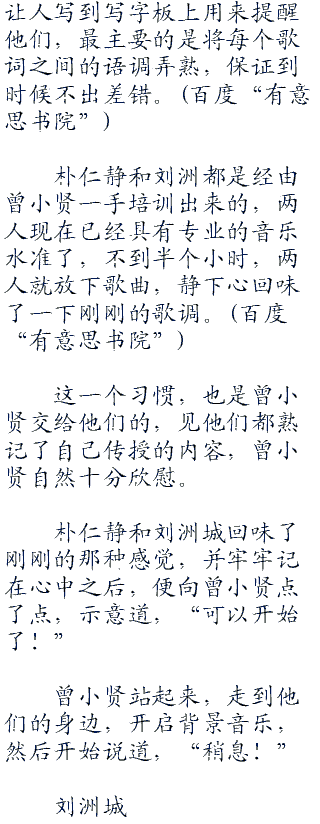 朴仁静和刘洲都是经由曾小贤一手培训出来的,两人现在已经具有专业的音乐水准了,不到半个小时,两人就放下歌曲,静下心回味了一下刚刚的歌调。