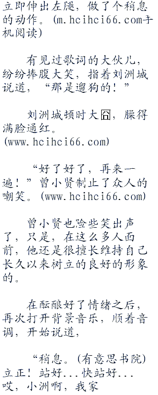 曾小贤站起来,走到他们的身边,开启背景音乐,然后开始说道,“稍息!”