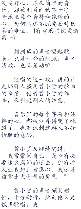 刘洲城接口唱道,“我只坐在键盘前,用心写自己原创歌曲,这是我的天赋和我的兴趣,谁在背后导演一出阴谋没安好心,原来简单的音乐,却被利益纠结不干净,音乐里每个音符和纯粹的心,为何总逃不脱要面对伪善的命运。”