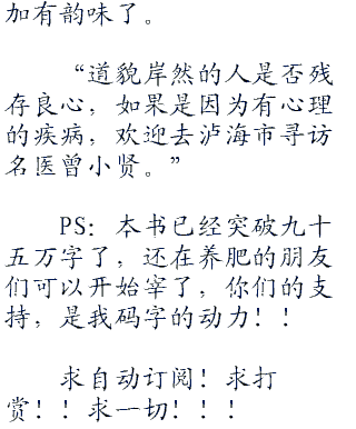 PS:本书已经突破九十五万字了,还在养肥的朋友们可以开始宰了,你们的支持,是我码字的动力!!