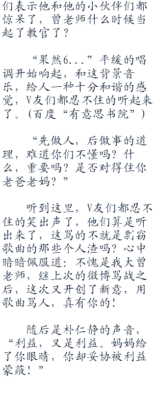 听到这里,V友们都忍不住的笑出声了,他们算是听出来了,这骂的不就是剽窃歌曲的那些个人渣吗?心中暗暗佩服道:不愧是我大曾老师,继上次的微博骂战之后,这次又开创了新意,用歌曲骂人,真有你的!