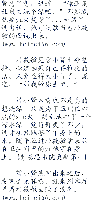 曾小贤本意也不是真的想洗澡,只是为了压制住心底的xie火,胡乱地冲了一个凉水澡,觉得舒爽了不少,这才胡乱地擦了下身上的水,随手扯过朴筱敏拿来放在卫生间里的yu袍穿在身上。