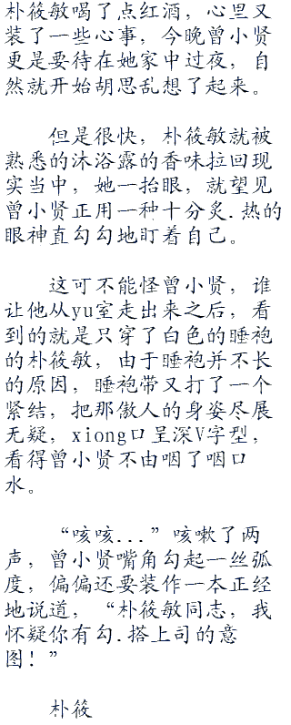 朴筱敏喝了点红酒,心里又装了一些心事,今晚曾小贤更是要待在她家中过夜,自然就开始胡思乱想了起来。