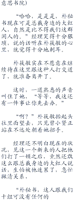 “哈哈,是是是,朴秘书现在可是总裁身边的大红人,自然是比不得我们这群闲人的。”经理笑得十分猥琐,说的话听在朴筱敏的心里,就觉得十分地刺耳。