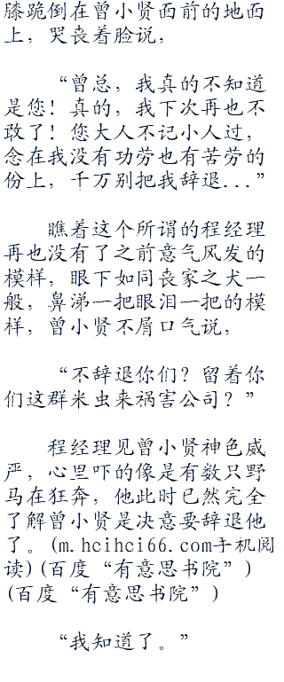 姓程的家伙没想到曾小贤如此风行雷厉,连一次改过的机会都不给就宣判了他们‘死刑’,他两腿一软,双膝跪倒在曾小贤面前的地面上,哭丧着脸说,