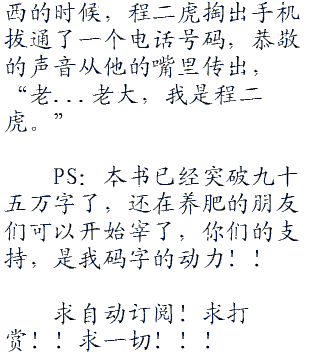 PS:本书已经突破九十五万字了,还在养肥的朋友们可以开始宰了,你们的支持,是我码字的动力!!