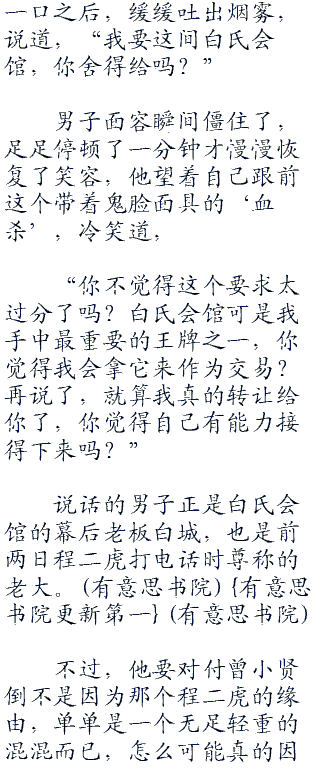 ‘血杀’起身走到男子身边,从他搁置在桌面上的烟盒中抽取出一根烟,然后为自己点上,狠狠吸了一口之后,缓缓吐出烟雾,说道,“我要这间白氏会馆,你舍得给吗?”