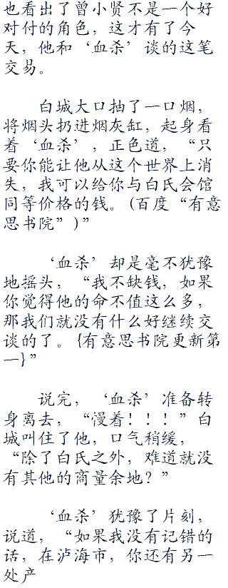 随后,白城专门找人调查了曾小贤的身份,他的一切资料。从资料之中,他也看出了曾小贤不是一个好对付的角色,这才有了今天,他和‘血杀’谈的这笔交易。