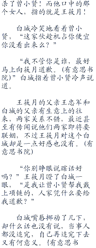 王筱月的父亲王忠军和白城的父亲有生意上的往来,两家关系不错,最近甚至有传闻说他们两家即将要联姻,不过王筱月对这个白城却是一点好感也没有。