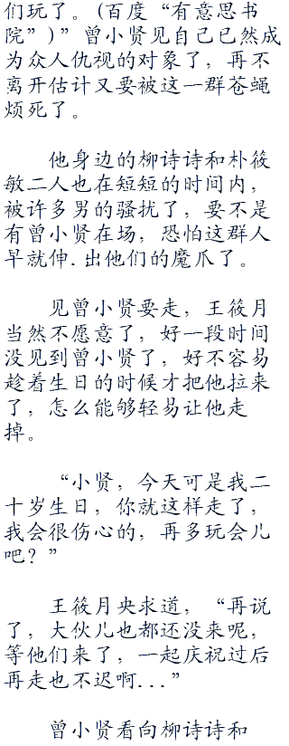 “小贤,今天可是我二十岁生日,你就这样走了,我会很伤心的,再多玩会儿吧?”