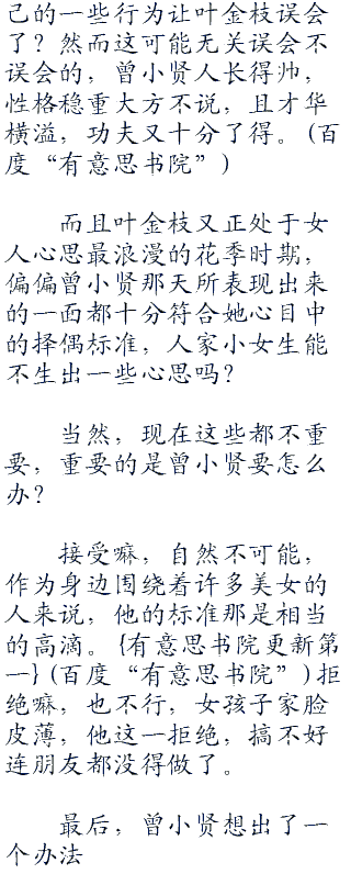而且叶金枝又正处于女人心思最浪漫的花季时期,偏偏曾小贤那天所表现出来的一面都十分符合她心目中的择偶标准,人家小女生能不生出一些心思吗?