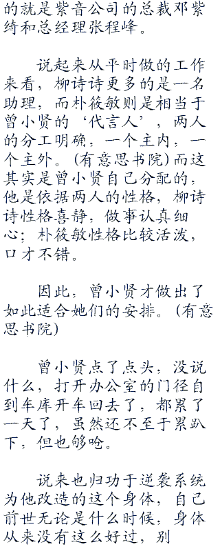 说起来从平时做的工作来看,柳诗诗更多的是一名助理,而朴筱敏则是相当于曾小贤的‘代言人’,两人的分工明确,一个主内,一个主外。而这其实是曾小贤自己分配的,他是依据两人的性格,柳诗诗性格喜静,做事认真细心;朴筱敏性格比较活泼,口才不错。