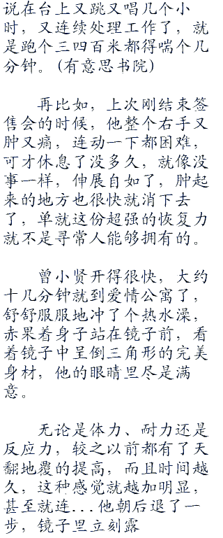 曾小贤开得很快,大约十几分钟就到爱情公寓了,舒舒服服地冲了个热水澡,赤果着身子站在镜子前,看着镜子中呈倒三角形的完美身材,他的眼睛里尽是满意。
