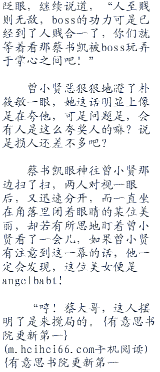 蔡书凯眼神往曾小贤那边扫了扫,两人对视一眼后,又迅速分开,而一直坐在角落里闭着眼睛的某位美丽,却若有所思地盯着曾小贤看了一会儿,如果曾小贤有注意到这一幕的话,他一定会发现,这位美女便是angelbabt!