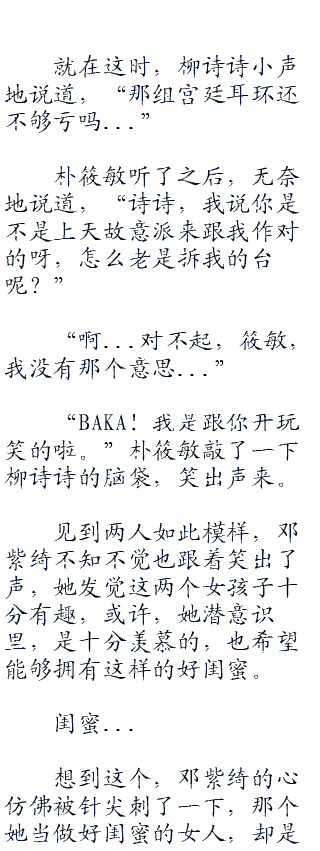 见到两人如此模样,邓紫绮不知不觉也跟着笑出了声,她发觉这两个女孩子十分有趣,或许,她潜意识里,是十分羡慕的,也希望能够拥有这样的好闺蜜。