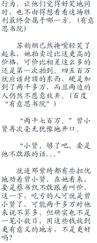 就连邓紫绮都有些担忧地劝着曾小贤,在她看来,要是蔡书凯不敢跟着叫价,这一下,吃亏的人可就是曾小贤了,可能两千多万对他来说不算多,但确实也不是一笔小数目,用这些钱放到更有意义的地方,不是更好吗?