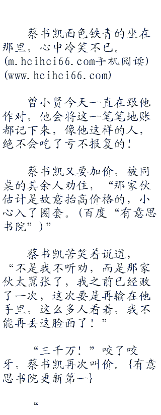 蔡书凯又要加价,被同桌的其余人劝住,“那家伙估计是故意抬高价格的,小心入了圈套。”
