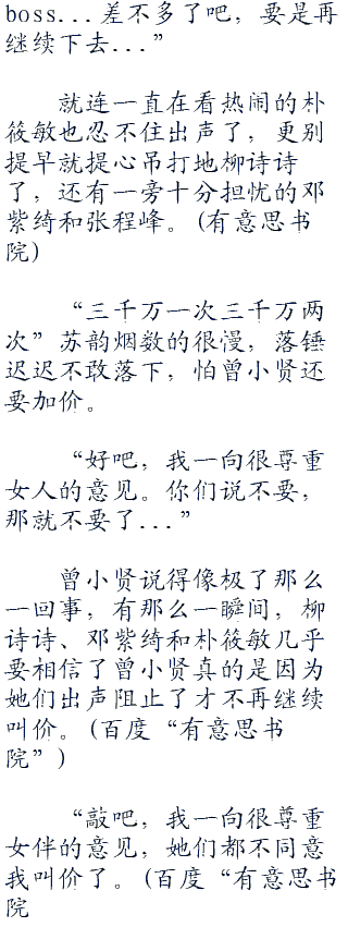 曾小贤说得像极了那么一回事,有那么一瞬间,柳诗诗、邓紫绮和朴筱敏几乎要相信了曾小贤真的是因为她们出声阻止了才不再继续叫价。