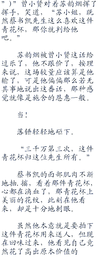“敲吧,我一向很尊重女伴的意见,她们都不同意我叫价了。”曾小贤对着苏韵烟挥了挥手,笑道,“苏小姐,既然蔡书凯先生这么喜欢这件青花杯,那你就判给他吧。”