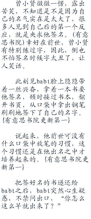把签好名的书递还给babt之后,babt突然心生疑惑,不禁问出口,“你怎么这么早就出来了?”