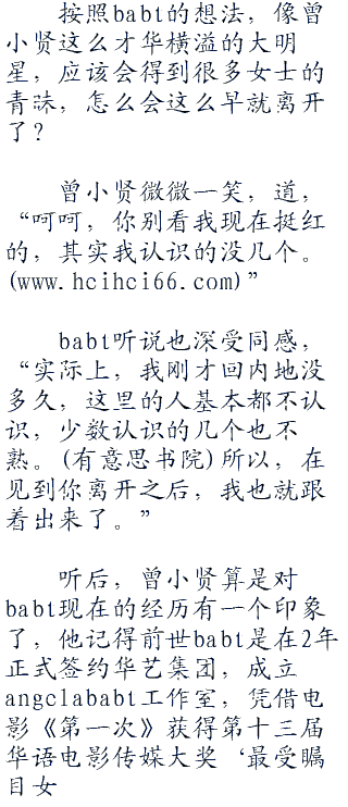 听后,曾小贤算是对babt现在的经历有一个印象了,他记得前世babt是在2012年正式签约华艺集团,成立angelababt工作室,凭借电影《第一次》获得第十三届华语电影传媒大奖‘最受瞩目女演员奖’。