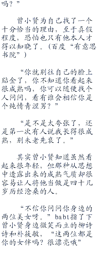“不信你问问你身边的两位美女呀。”babt指了下曾小贤身边微笑而立的柳诗诗和朴筱敏,“这两位都是你的女伴吗?很漂亮哦~~~”