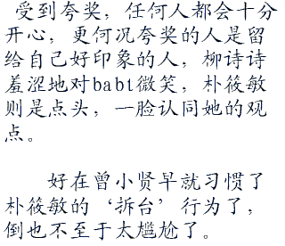 受到夸奖,任何人都会十分开心,更何况夸奖的人是留给自己好印象的人,柳诗诗羞涩地对babt微笑,朴筱敏则是点头,一脸认同她的观点。