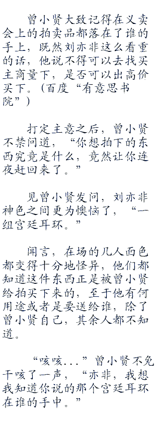 “咳咳...”曾小贤不免干咳了一声,“亦非,我想我知道你说的那个宫廷耳环在谁的手中。”