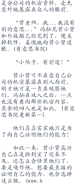 曾小贤可不在意自己公司的机密暴露在别人面前,刚才他可是一直在观察他们,冯灿在攻入之后,一点也没有看向那些机密内容,其余的四人也是如此。