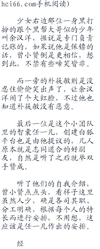 少女右边那位一身黑打扮的跟个黑帮大哥似的少年叫余汉洋,据说是专门负责记账的,如果说他是保镖的话,曾小贤倒是更相信,想到此,不禁有些啼笑皆非。